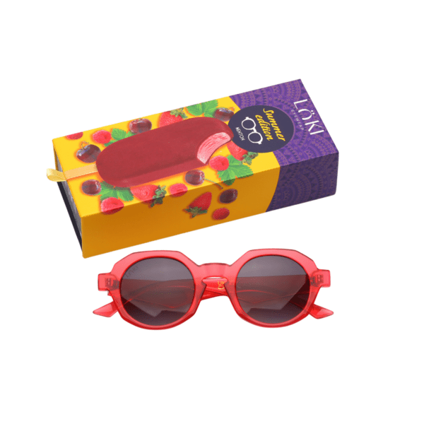 Gafas de sol femeninas Löki KS115. Montura rojo - red, ligera y resistente en Injected Plastic, con forma redonda y lentes negras. Un diseño atemporal y práctico de la colección Menton, ideal para uso diario.