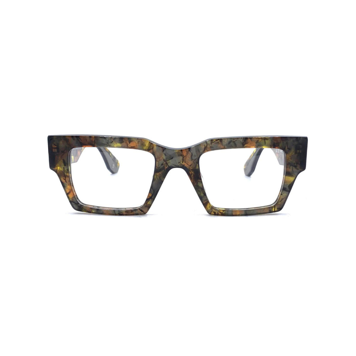 Las gafas ópticas Kelinse KEL5462 destacan por su diseño cuadrado de líneas definidas y su acabado camuflaje gris y amarillo.