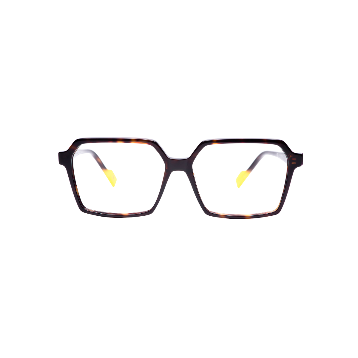 Su montura de acetato carey oscuro con puntas amarilla aporta solidez, estilo y comodidad, mientras que sus proporciones bien estudiadas garantizan un ajuste estable durante todo el día.
