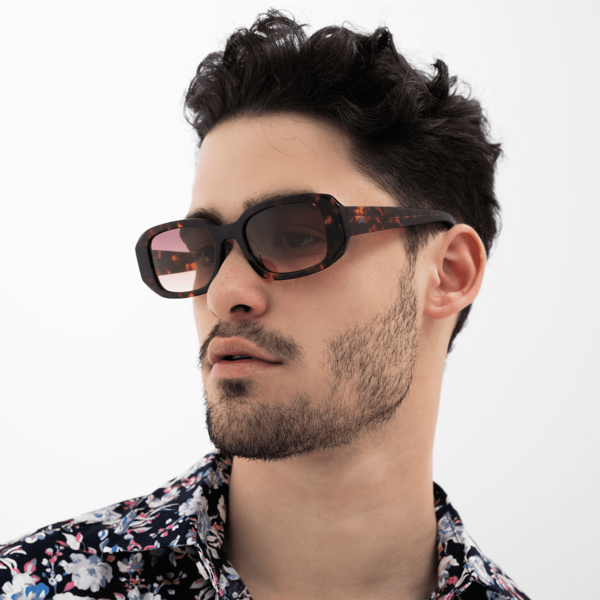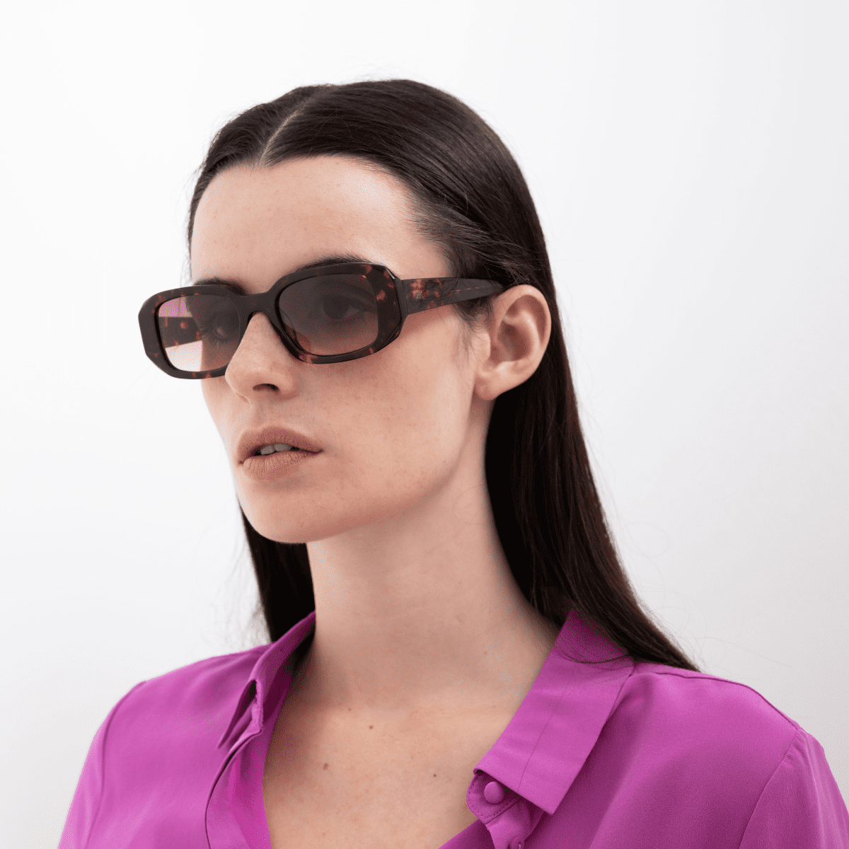 Montura carey y lentes lila degradadas (“Gradient Lila”), aportando un look sofisticado y adaptable a múltiples estilos.