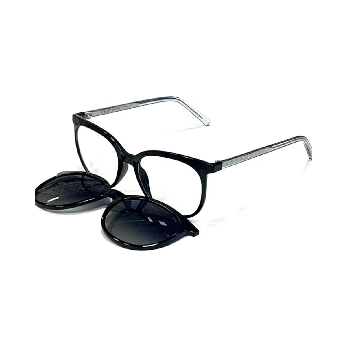 Su montura redonda de acetato negro aporta un estilo moderno y equilibrado, mientras que el clip-on permite una adaptación rápida a diferentes condiciones de luz.